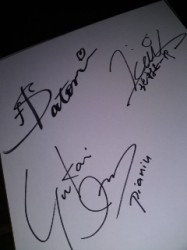 Blog Archives(~2018年) 2010-05-29 本日のサインです。 今夜のライブは、横浜・関内《よいどれ伯爵》にて。バイオリンの里見紀子さんとボイスパーカッションの北村嘉一郎さんとのお久しぶりなセッション。こちらは、今日の三人のサインであります〜(*^o^*) コメントフィールドを閉じる コメントはこちらからメールアドレスは公開されませんのでご安心ください。* が付いている欄は必須項目となります。名前 * メール * Δ PREV NEXT