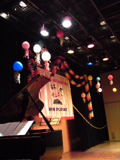 本日は上用賀《アートホール》にて、インターナショナルスクールのイベントでの演奏。ボーカルのギラ・ジルカさん、ベースの新井武志さん、ボイスパーカッションの北村嘉一郎さんと楽しくご一緒でした。舞台袖からかわいいステージをパチリ〜(*^o^*)