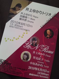 こちらは来月横浜・桜木町「ドルフィー」で予定している、日曜お昼のライブのお知らせであります。1日はおなじみ「井上ゆかりトリオ」(この日は「みなとみらい」で花火大会です)、8日は、名古屋のあかねちゃんと紀ちゃんとのコラボレーション。夏の休日の昼下がり、ぜひぶらりと楽しみにいらしてくださいね〜(*^_^*)