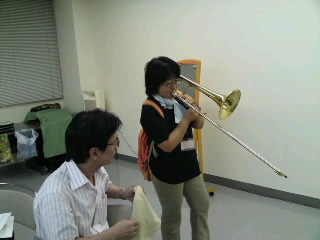 ジャズタウンの楽屋にて…スタッフでトロンボーン奏者の森山由香里さんが、向井さんのレッスンを受ける図であります〜(*^o^*)