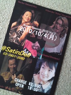 こちらは、10/4《サテンドール・スーパーセッション》のお知らせ!トリニダード・トバゴ出身スティールパン奏者のトニー・グッピーさんとは今回初共演です。どんなサウンドにあいなりますか、どうぞお楽しみに…(#^.^#)