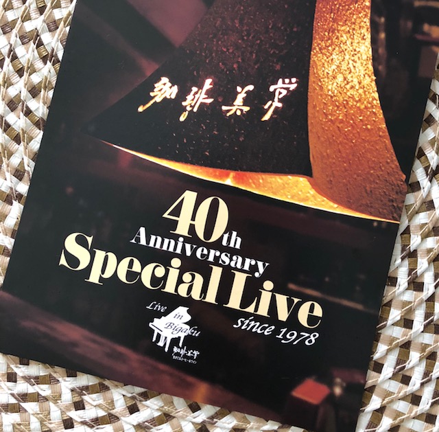 Blog Archives(~2018年) 2018-04-16 40周年! いつもお世話になっている学芸大学のライブハウス「珈琲美学」から、40周年記念ライブの素敵なパンフレットが届きました!オーナー原さんご夫妻がこつこつと歩んでこられた、歴史の深みを感じます(o^^o) コメントフィールドを閉じる コメントはこちらからメールアドレスは公開されませんのでご安心ください。* が付いている欄は必須項目となります。名前 * メール * Δ PREV NEXT