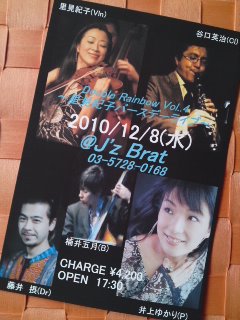 毎回多彩なゲストをお招きしてお送りする、バイオリン里見紀子さんとの「ダブルレインボー」トーク&ライブ。今回(12/8)のゲストは、二人がよくご一緒している素敵なミュージシャン「クラリネット・谷口英治さん、ベース・楠井五月さん、ドラムス・藤井摂さん」のお三方。また12/8は紀ちゃんのお誕生日でもあり、ワタクシのトリオのセカンドアルバム「MURASAKI」発売日でもあります。気心の知れた仲間との楽しいステージをどうぞお楽しみに…(#^.^#)