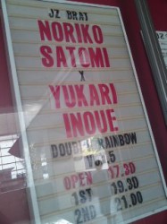 今夜のライブは、渋谷『JzBrat』にて、バイオリンの里見紀子さんとのユニット《ダブルレインボー》のライブ。今日は、ゲストに東京スカパラダイス・オーケストラのトロンボーン・北原雅彦さん、ベース・生沼邦夫さん、パーカッション・岡部洋一さんをお迎えして楽しくお届けいたします〜(=^_^=)