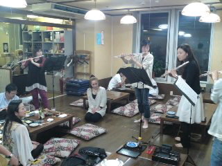 『バックステージ』のライブを終えて…信平親分の博多のお弟子さん&孫弟子さんたちが打ち上げの席上で、とっても美しいフルート・アンサンブルを聴かせてくださいました。心のこもった思いがけないサプライズ、ホントにうれしかったです〜(=^_^=)