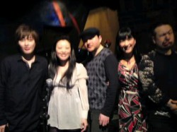 今夜のライブは、お久しぶりに出演させていただく六本木《サテンドール》にて。バイオリンの里見紀子さん、ギターの吉田智さん、ベースの生沼邦夫さん、パーカッションの岡部洋一さんとの初組み合わせなセッション。世界中を旅するような幅広〜い選曲で、楽しく熱いステージになりました!最後にみんな並んでパチリです(右端はおちゃめな岡部さん)!