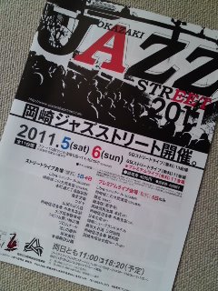 こちらは、毎年出演させていただいている愛知県岡崎市のジャズフェスティバル「岡崎ジャズストリート」のパンフレット。今年も「Primavera」のメンバー(Flute-井上信平さん・Violin-里見紀子さん)で、11/6に出演させていただきますよ〜(∩.∩)