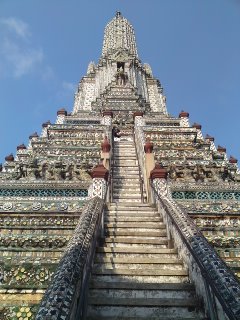 バンコクの青空にそびえたつ《ワット・アルン》の大仏塔。朝から30度をこえる暑さと、あまりの高さにクラクラして…石段の中腹でギブアップしてしまいました〜(^_^;)