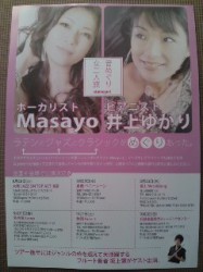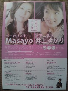 この夏繰り広げるラテンボーカル・Masayoさんとの『音めぐり女二人旅』。7月『東京〜北海道〜東北』に続いて第2弾は、8月『中国〜関西〜東海』バージョンです。後半にはフルート・坂上領さんも加わり、楽しくお届けしますよ〜(*^o^*)