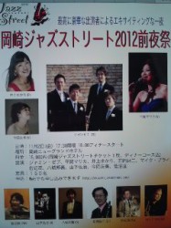 11月3日〜4日に開催される愛知県岡崎のジャズフェスティバル『岡崎ジャズストリート』。今年は、2日の前夜祭にも出演させていただく予定ですが、前夜祭のチケットは早くも完売、ご予約終了だそうですので、皆さまどうかご了承下さいませ〜(=^_^=)