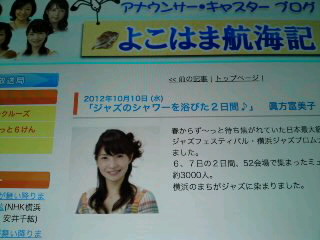 先日6日に出演させていただいた「横浜ジャズプロムナード」でお世話になったNHK横浜放送局のキャスター・眞方富美子さんが、ライブの模様をアップしてくださっています。こちらから、ご覧になれますよ〜(^O^)