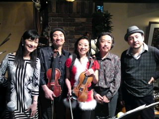 クリスマスのライブは、六本木『サテンドール』にて。バイオリンの里見紀子さんと太田恵資さん、ベースの生沼邦夫さん、ドラムスの久米雅之さんとのセット。めちゃ楽しいステージを終えて、パチリです〜(*^∇^*)