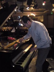 今夜のライブは、関内『よいどれ伯爵』にて。バイオリンの里見紀子さんとフラメンコギターの高木潤一さんとのユニット『ラ・パシオン』であります。あちこちのライブハウスで、いつも調律でお世話になっている土田さんをパチリ〜(*^∇^*)