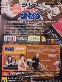 こちらは、7/2〜31に新宿「J」で開かれる「ジャズ meets 梨園染」のお知らせ。日本伝統の梨園染のゆかたや手ぬぐい・美しいキャンドルたちが店内を彩ります。ちょっと珍しい江戸の粋とJAZZのコラボレーションをどうぞお楽しみに…(^^)