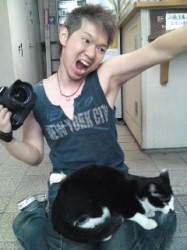 そしてこちらは…本厚木《キャビン》で、毎回ライブの写真撮影や記録係をして下さっているスーさん。キャビンの看板ねこちゃんと一緒に、弾けたポーズでパチリ!いつもどうもありがとうございます〜(=^_^=)