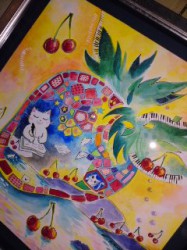 今夜のライブは、新宿『J』にて。ボーカルの河村留理子さん・バイオリンの里見紀子さんとのセット。店内をカラフルに飾る、イラストレーター・川和千鶴さんのかわいい水彩画をパチリです〜(o^-^o)