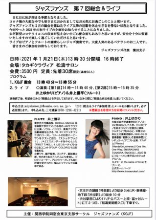 ◆1/21(木)◆『日程延期となりました』 「関西学院同窓会東京支部 ジャズファンズ主催 ライブ」 松濤「タカギクラヴィア 松濤サロン」pm2:00〜2set (お問合せ先 070-1296-4231 miyakekenji@samba.ocn.ne.jp. 三宅健嗣) takagiklavier.com/salon.html (渋谷区松濤1-26-4) 出演者: Flute-井上信平 (¥3500 先着30席限定)