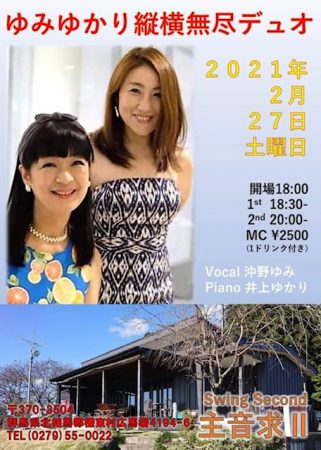 ◆2/27(土)◆ 群馬榛名「主音求 II (スイングセカンド)」(0279-55-0022)pm7:00〜 swing-2.com 出演者:Vocal-沖野ゆみ Piano-井上ゆかり