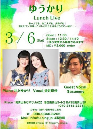 Blog 2021-03-04 ゆうかり+ササミー❣️ 今週末6日のお昼ライブは、ゆうかりとササミーの初コラボ❣️とっても楽しいステージになりそうです💛🌈 ◆3/6(土)◆ 南青山「おむすびJAZZ」(070-3115-3331)pm12:30〜2set 港区南青山3-4-2 BASE南青山3F 出演者:Vocal-金井優佳 Guest・Vocal-Sasammy Piano-井上ゆかり コメントフィールドを閉じる コメントはこちらからメールアドレスは公開されませんのでご安心ください。* が付いている欄は必須項目となります。名前 * メール * Δ PREV NEXT