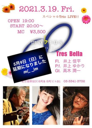 ◆5/9(日)◆「Tres Bella」 四谷「メビウス」(3341-3732)pm6:00〜 www.mebius-yotsuya.jp/ 出演者: Flute-井上信平 Guitar-高木潤一 Piano-井上ゆかり