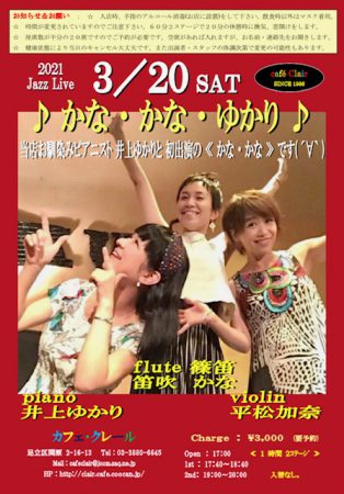 ◆3/20(日・祝)◆「かなかなゆかり」 西新井「カフェクレール」(3880-6645)pm4:40〜 clair.cafe.coocan.jp/ 出演者:Violin-平松加奈 Flute&篠笛-笛吹かな Piano-井上ゆかり