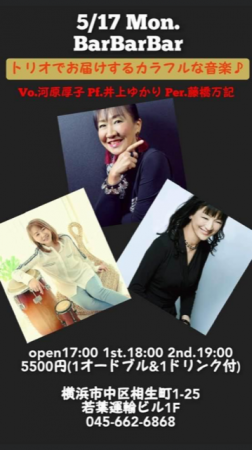 ◆5/17(月)◆ 関内「Bar Bar Bar 1F」(045-662-6868)pm6:00〜/7:00〜 www.barbarbar.jp/sp/ 出演者: Vocal-河原厚子 Percussion-藤橋万記 Piano-井上ゆかり (¥5500 1オードブル&1ドリンク付)