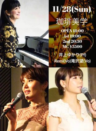 ◆11/28(日)◆ 学芸大学「珈琲美学」(3710-1695)pm7:00〜/8:30〜 www.coffeebigaku.com/ 出演者:Vocal-滝沢望 Vocal-Remi Piano-井上ゆかり