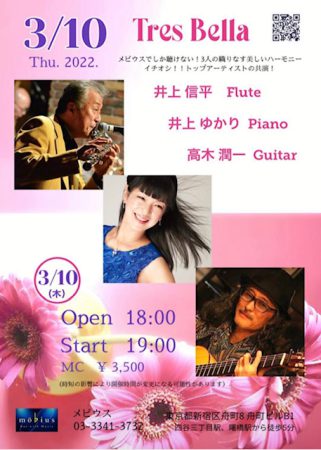 ◆3/10(木)◆「Tres Bella」 四谷3丁目「メビウス」(3341-3732)pm7:00〜2set www.mebius-yotsuya.jp/ Flute-井上信平 Guitar-高木潤一 Piano-井上ゆかり