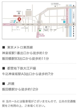 会場の神楽坂「音楽の友ホール」へのアクセスについてお問い合わせいただきましたので、改めてお知らせいたします。
