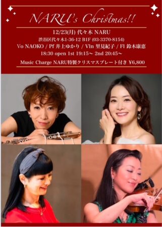 ◆12/23(月)◆ 代々木「NARU」(3370-8154) pm7:15〜/8:45〜 www.yoyogi-naru.com/ Vocal-NAOKO Flute-鈴木康恵 Violin-里見紀子 Piano-井上ゆかり