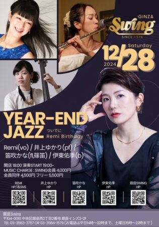 ◆12/28(土)◆ 銀座「スウィング」(3563-3757) pm7:00〜 ginzaswing.jp Vocal-Remi Flute-笛吹かな Bass-伊東佑季 Piano-井上ゆかり