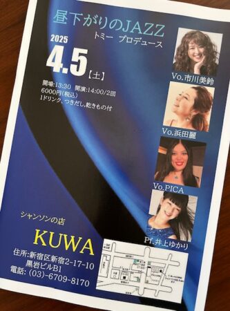 ◆4/5(土)◆「昼下がりのJAZZ」 新宿「KUWA」(6709-8170) pm2:00〜2set chanson-shinjuku-kuwa.jimdofree.com/ Vocal-市川美鈴&PICA&濱田麗 Piano-井上ゆかり