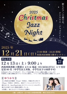 毎年たくさんの方々にご好評いただいている、西葛西図書館『ゆうかりクリスマスジャズナイト』❣️今年は、来月12/13 朝9:00から、お電話と図書館窓口で受付開始です。絵本の朗読など、図書館ならではのひとときをどうぞごゆっ