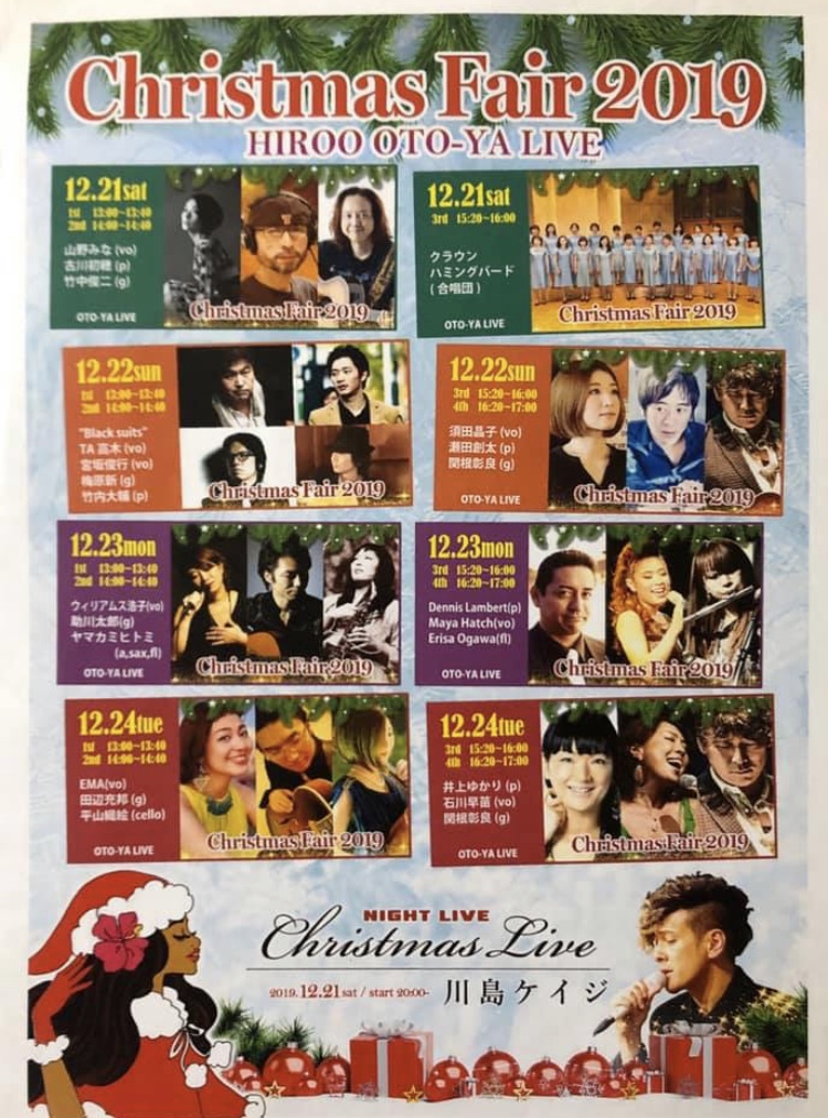 素敵ミュージシャンたちが、連日登場する広尾プラザ「OTOYA HIROO クリスマスフェア2019」❣️ボーカル石川早苗ちゃんとギター関根彰良さんとのトリオで、24日クリスマスイブの日に出演いたします。お近くの方はぜひ❤