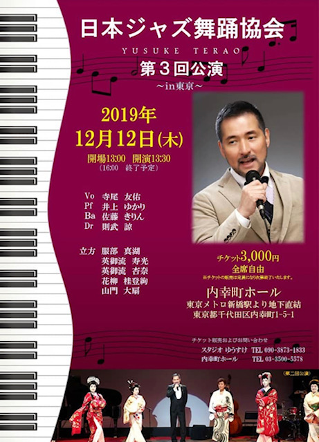 今週12日「内幸町ホール」で出演させていただく「ジャズと日本舞踊」コラボレーションステージ❣️おかげさまで、お席の方がかなり埋まっているようです。チケットのお問い合わせなどは、主催の寺尾さんかホールまで、ご連絡頂けますよ