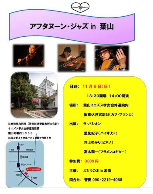 来月11/8「ラ・パシオン」で出演させていただく葉山・旧東伏見邸でのライブは、おかげさまでチケット完売になったそうです❣️ご予約くださったみなさま、どうもありがとうございます。当日は、どうぞごゆっくり😊❤️😊 ◆11/8
