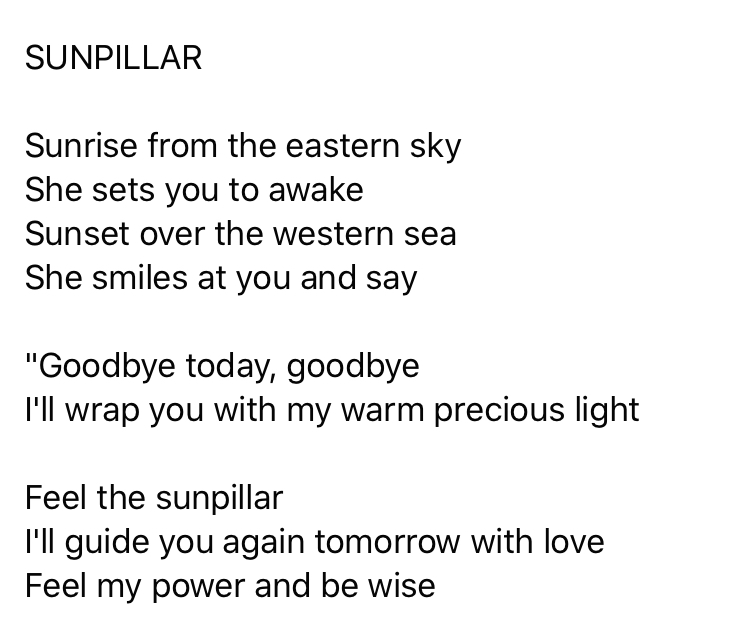 こちらは、さきほどUPしたオリジナル曲「Sunpillar」のゆみちゃん作の歌詞。光が、私たちを包んでくれますように🌠