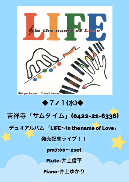 フルート信平親分との初のデュオアルバム「LIFE〜in the name of Love〜」。いよいよ、来週7/1「リリース&レコ発初日」です❣️❣️ 奇しくも同じ苗字「井上さん」のご縁から、「名前」にちなんだ