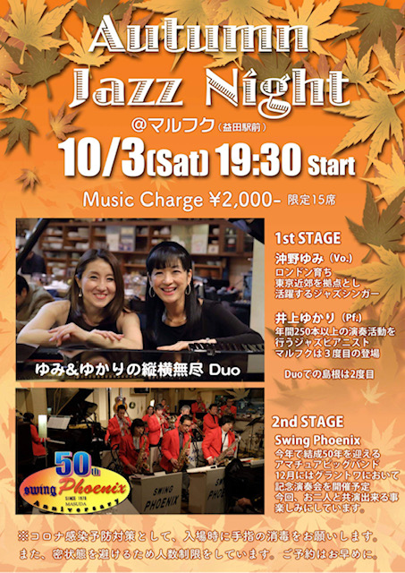 来月10/2.3に伺う「ゆみ&ゆかり島根ツアー」は、出雲ミスティーと益田マルフクでのステージ❣️益田では、創立50周年の老舗ビッグバンド「スウィングフェニックス」との初共演です。お客様の人数限定ではありますが、