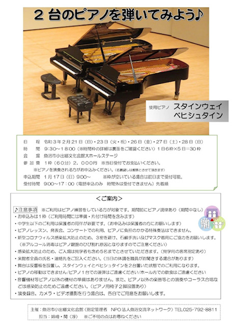 明後日30日、雪洞まつりのコンサートで伺う予定の新潟魚沼市小出郷文化会館。来月の「スタインウェイとベヒシュタインピアノ・2台ピアノを弾いてみよう!」イベントも、めちゃめちゃ素敵ですね😊❤️😊