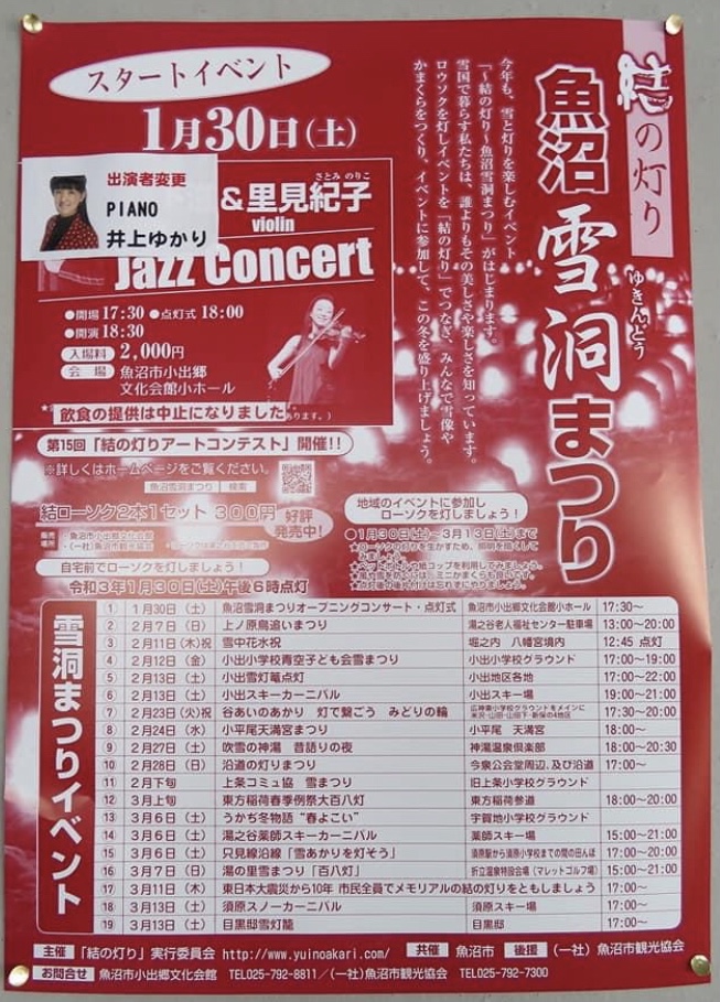 今月30日、新潟魚沼雪洞まつりのジャズコンサートへ、急きょ出演させていただくことになりました❣️新潟に伺うのは、お久しぶりです。たくさんの方々に楽しんでいただけますように😊❤️😊 ◆1/30(土)◆「〜結の灯り〜魚沼