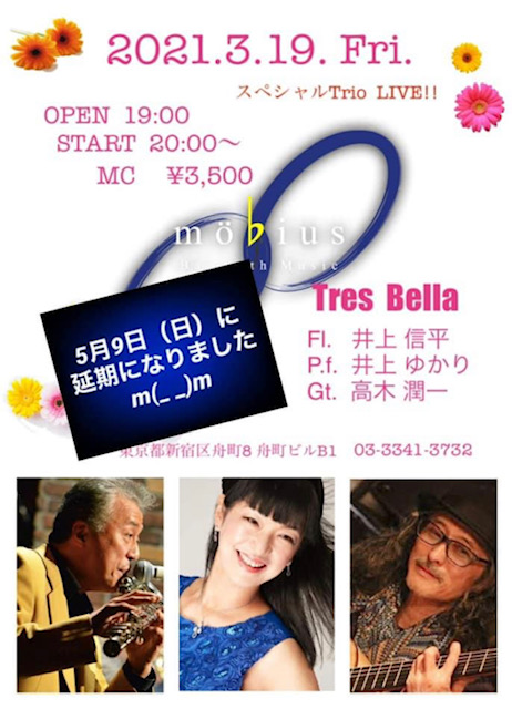 今週19日に予定していました四谷「メビウス」でのステージは、5/9に日程延期となりました❣️5:00オープン、6:00スタートの予定ですので、どうぞご了承くださいませ😊🙏😊 ◆5/9(日)◆「Tres Bella」 四谷
