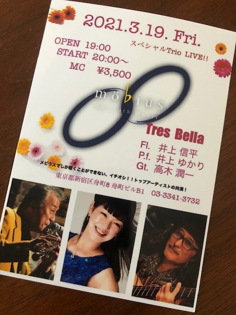 19日に出演させていただく予定の四谷「メビウス」での「Tres Bella」ライブは、残念ながら日程延期となりました。詳しい日程が決まりましたら、お知らせいたしますので、どうぞご了承くださいませ😊🙏😊