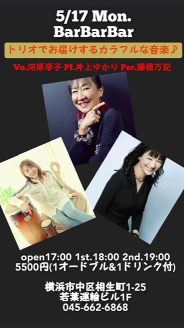 明日17日は、厚子さん&万記ちゃんと❣️かれこれ3週間ぶりなステージ、ちゃんと指が動いてくれますように😅😅😅 ◆5/17(月)◆ 関内「Bar Bar Bar 1F」(045-662-6868)pm6:00〜/