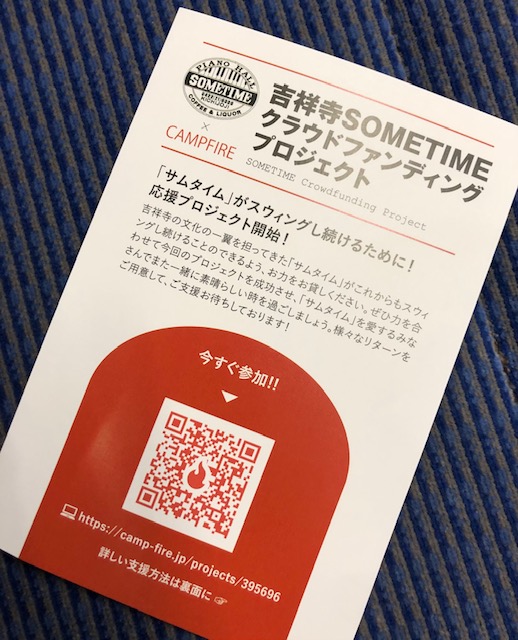 お世話になっている吉祥寺「サムタイム」のクラウドファンディングプロジェクト、終了まであと2日だそうです😊🙏😊 camp-fire.jp/projects/view/395696?fbclid=IwAR19eemm2JHp