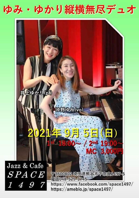 来月5日のゆみゆかりライブは、群馬「日新館」から熊谷「Space1497」へ変更となりました。4日のスイングセカンドと同じく、6:00スタートの開催となっております。ご尽力くださった方々に感謝しつつ、みなさまどうぞご了承