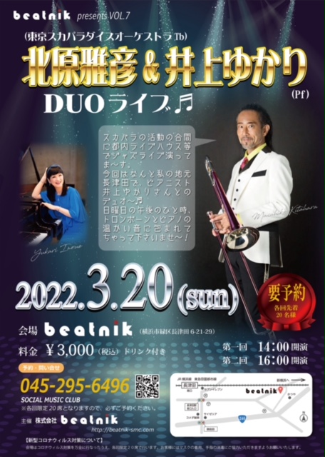 来月3/20に出演させていただく、スカパラのトロンボーン北原雅彦さんとのステージ。おかげさまで各ステージとも、かなりお席が埋まっているそうです。キャンセル待ちなどは、お店までお問い合わせいただけますよう、どうぞよろしくお