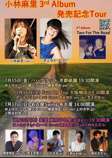 明日15日から、小林麻里さんのアルバムリリースツアーで、京都〜大阪〜名古屋に伺います❣️各地でたくさんの方々に、楽しんでいただけますように😊💕😊 「小林麻里3rd album 発売記念ツアー」 ◆7/15(金)◆ 京都祇