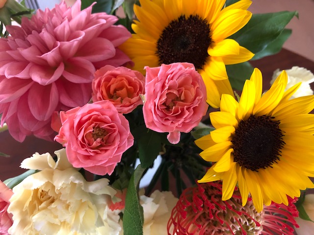 夏の色の花束いただきました❣️ひまわり、ダリア、バラなど、鮮やかな色合いが目に嬉しいですね💐