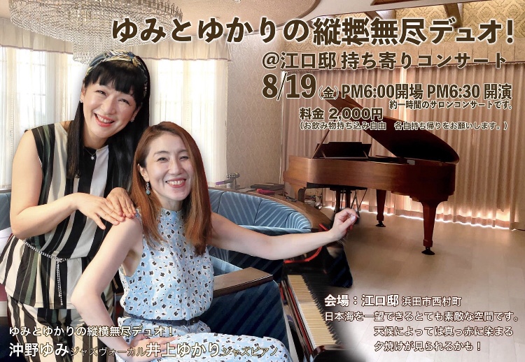 「ゆみ&ゆかり島根ツアー」の初日は、浜田からスタートです❣️とても素敵な空間、楽しみに伺いますね😊💕😊 ◆8/19(金)◆ 「ゆみ&ゆかり 島根ツアー@浜田」 島根浜田「江口様邸」 pm6:30〜1set Vo